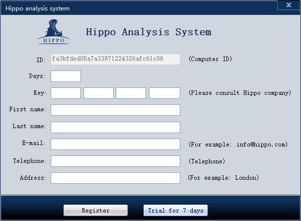 1)     Double click Hippo intelligent analysis system to open the registration window. (Figure 1), enter the registration code and user information to register or click "register". (the trial version doesn't need to click Register, just select "7 days of trial" directly.)
