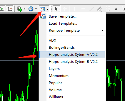 4) Open the MT4 client software, click the "Template" button, and select "Hippo intelligent analysis system v7.1". (Figure 6)
