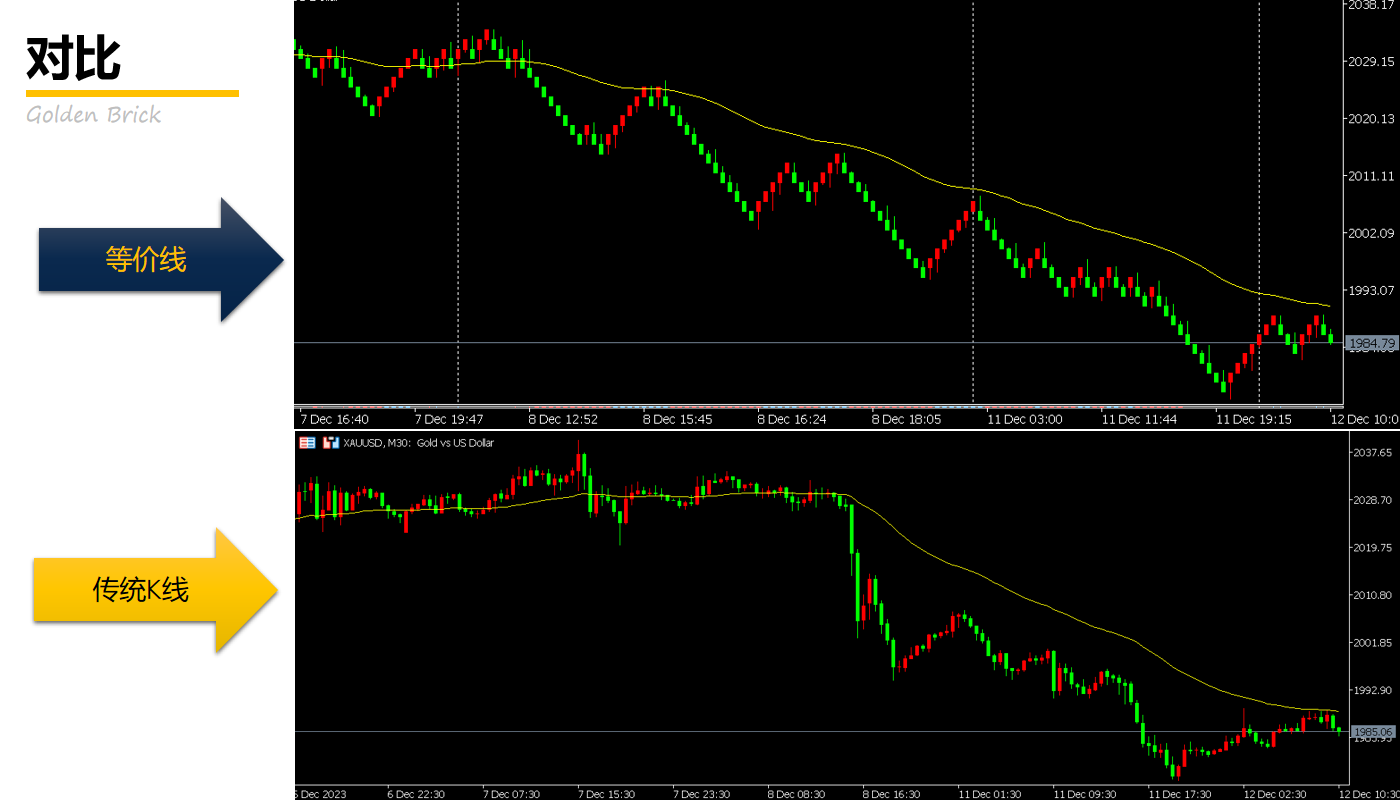 等价线没有时间概念,是纯物理空间的产物。假如设置等价线的高度为10个点(pips),只要价格涨/跌10个点就会出现一根等价线。如果行情一直在10个点之间来回震荡,就不会出现新的等价线。