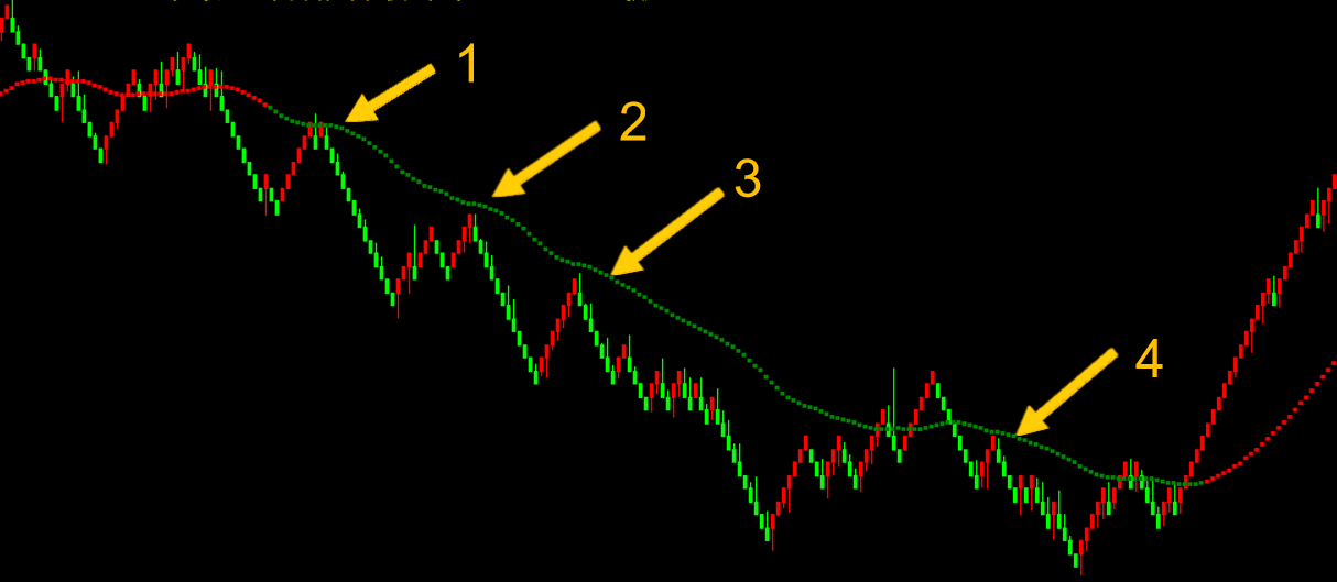 入场点:在均线下方价格接近均线,由红变绿做空。