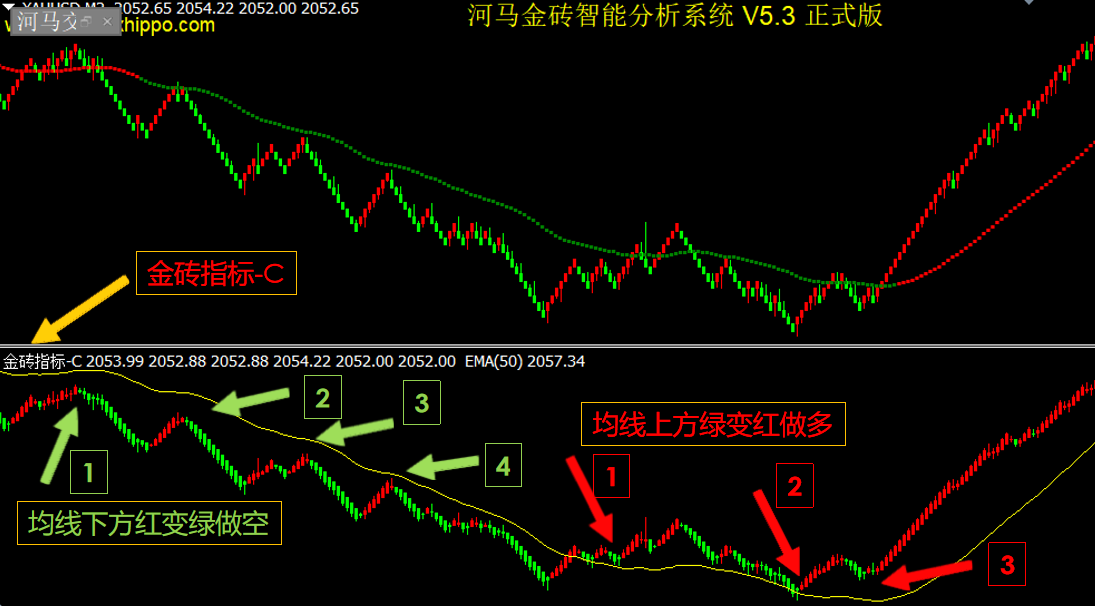 交易方向:红色做多,绿色做空。下图:绿色,在均线下方,只做空单。