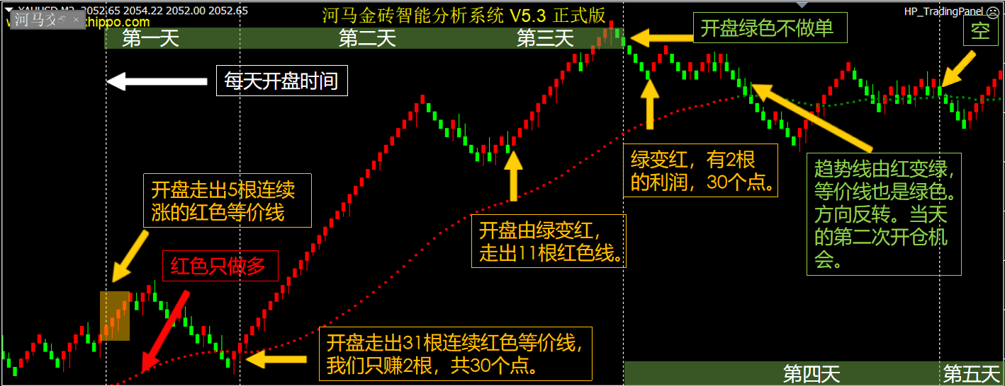 Hippo金砖智能分析系统去除时间概念,以纯物理空间概念来表现K线数据。可以更加清晰的表达交易品种的价值。去除了K线毛刺,避免了受震荡行情对情绪的影响。让客户更客观的完成交易。