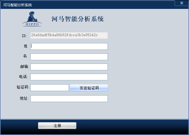 1) 双击《河马金砖-智能分析系统》安装文件后,会弹出注册窗口。(如图1所示)所示输入用户信息和验证码后点击“注册”按钮。