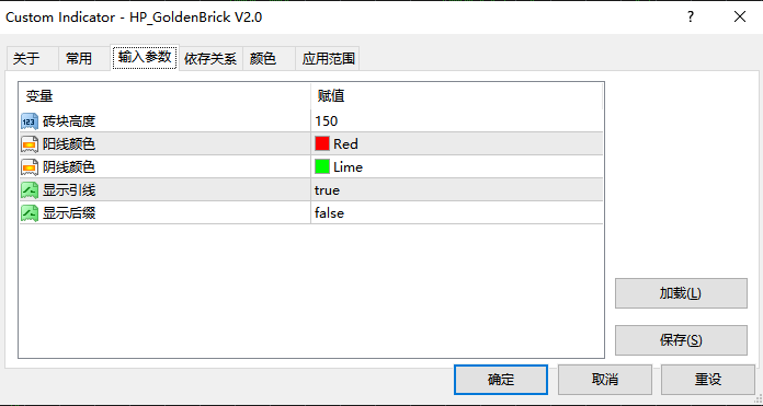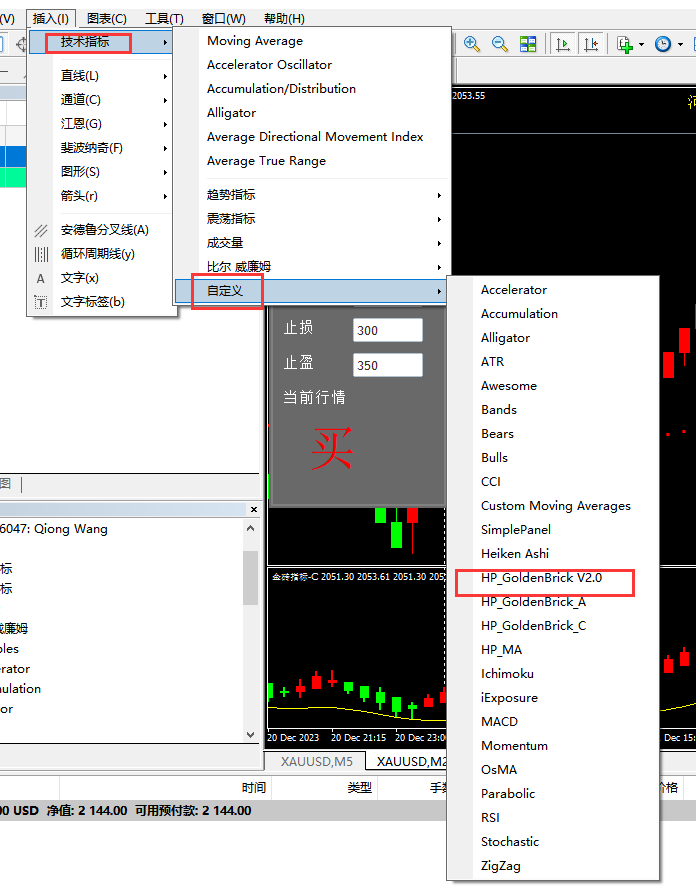 4)、打开MT4客户端软件单击‘插入’按钮,选择技术指标,选择自定义,选择‘Hippo GoldenBrick V2.0’加载指标程序。