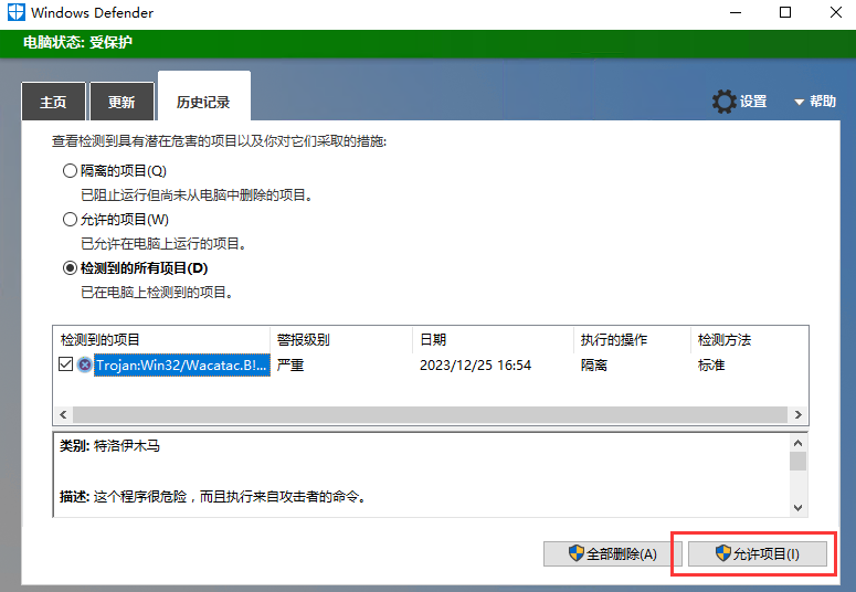 2), Windows自带的Defender系统通常也会自动将本程序隔离,需要在Defender历史记录里找到可执行文件,允许项目运行后重新执行安装程序,