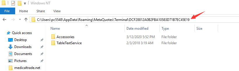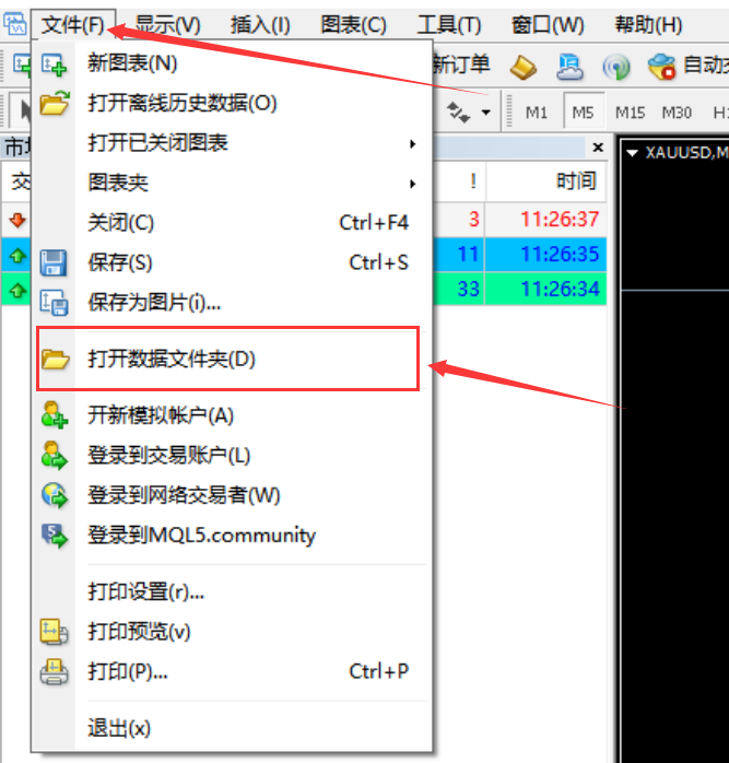 A、打开要安装的MT4客户端,选择“文件”菜单->“打开数据文件夹”打开数据文件夹窗口(如图2所示)。