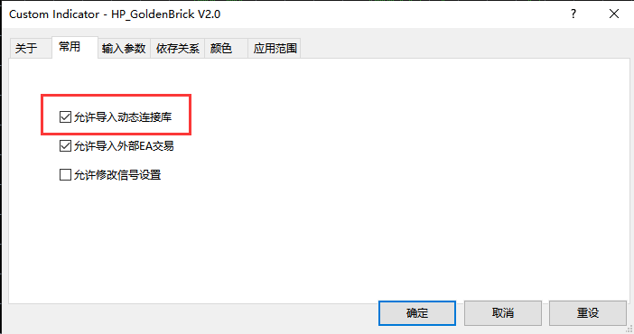 弹出窗口后选择指标属性选项框里的“常用”选项卡,选择“允许导入动态链接库”