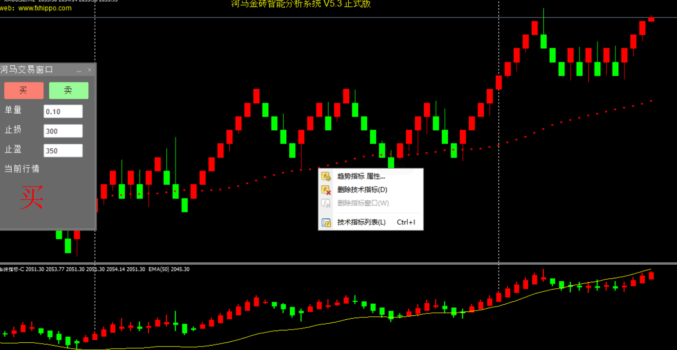 2.1右击图表中红绿色指标线,选择“开仓指令属性”。(图8)打开系统参数设置窗口。